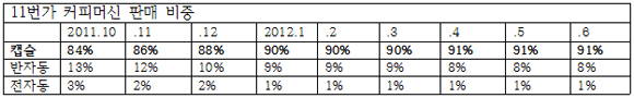 반면, 최근 3~4년간 커피 머신의 대중화를 이끈 반자동 머신 판매량은 조금씩 떨어지고 있는 추세로, 작년 6월 캡슐커피머신이 등장한 후 판매량으로는 명함도 못내미는 처지가 됐다.