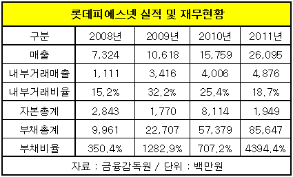 롯데피에스넷은 계열사 일감을 도맡아 하면서 급성장했지만 재무상황은 좋지 않은 편이다.