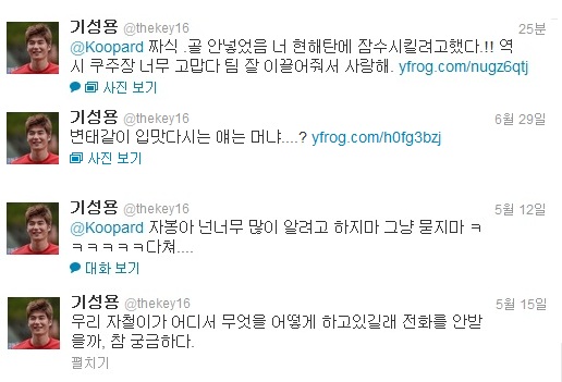 특히 여성팬들이 많은 한국 남자축구 대표팀의 미남 동갑내기 기성용과 구자철이 절친인 것으로 확인됐다. 특히 기성용은 구자철의 킬러가 아닌가 싶을 정도로 살가운 트윗질로 관심이 모아지고 있다.