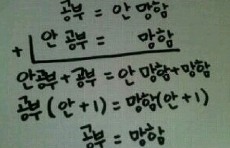 해당 사진은 ‘공부하면 망한다’는 명제를 수학 공식을 이용해 입증한 것으로, 수식은 공부는 '안 망함'으로, 안 공부는 '망함'으로 정의한 다음, 안 공부와 공부를 더한 것은 안 망함과 망함을 더한 것과 같다고 정리한다.