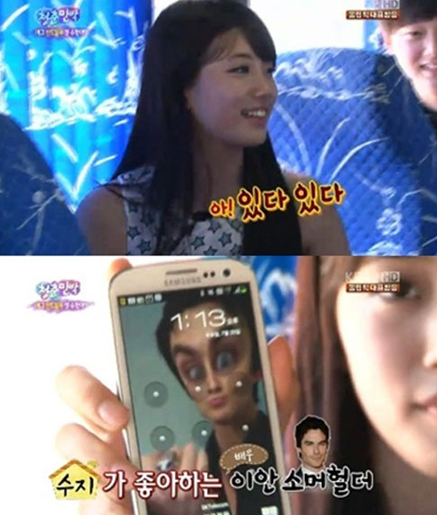 수지가 공개한 남자친구는 영화배우 이안 소머헐더(34). 출연진들이 남자친구가 아니라 이상형이라며 놀리자 수지는 “부끄럽다”며 얼굴을 붉혔다.