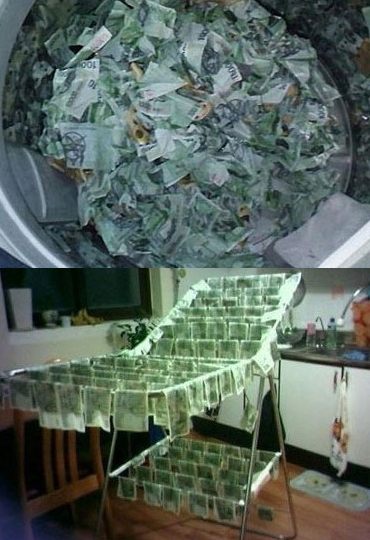 공개된 사진에는 빨래 건조대 위에 물에 젖은 만 원짜리 지폐가 걸려있다. 글쓴이에 따르면 약 1500만원을 세탁기 안에 숨겨 놓은 것을 깜빡하고 세탁기를 돌려, 돈을 건조대에 말리게 된 것이라는 설명이다.