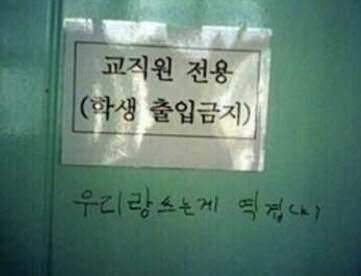 공개된 사진에는 '교직원 전용(학생 출입금지)라는 문구가 쓰여져 있는 메모판이 있다. 이 메모판을 본 학생은 기분이 나빴는지 그 밑에 '우리랑 쓰는게 역겹냐?'라는 글로 댓글을 달아 보는 이의 웃음을 자아냈다.