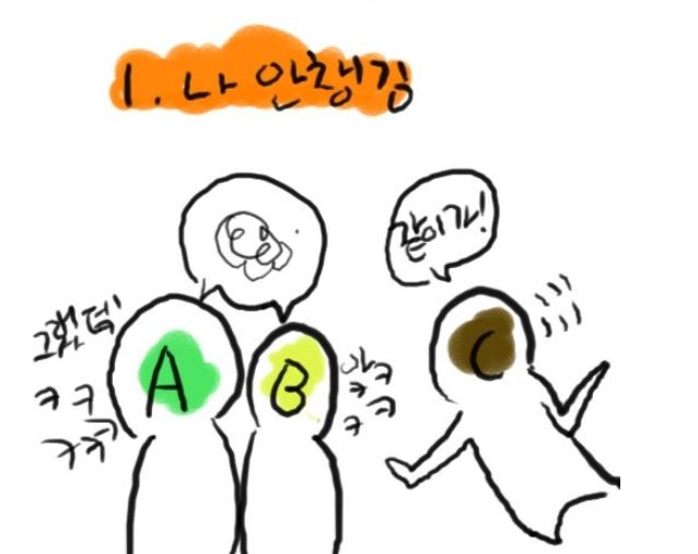 그림 속에는 친구 세명을 A,B,C로 표현한 가운데 상황극을 연출해 공감을 자아낸다. 첫번째 공감은 '나 안 챙김'으로 셋이 걷거나 얘기하다보면 한명이 소외된다고 꼬집고 있다.