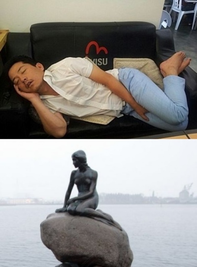 개그맨 김준호가 인어공주 자세로 숙면을 취해 웃음을 자아냈다.