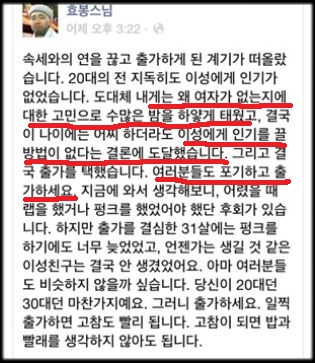 최근 온라인 게시판에는 자신의 트위터에 속세와 인연을 끊고 출가하게된 사연을 남긴 효봉스님의 글이 화제다.