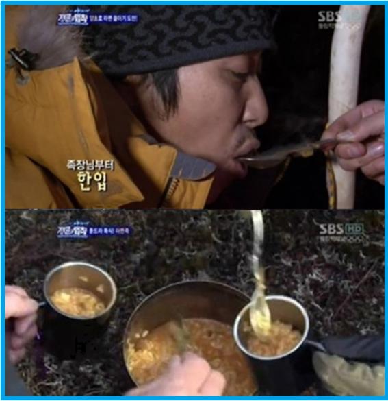 이 라면죽을 만들기 위해 김병만은 1시간을 촛불로 물을 끓여야 했다. 이후 '라면죽'을 먹은 멤버들은 "이렇게 맛있는 죽은 처음" 이라며 "여기 와서 제일 밥다운 밥을 먹는 것 같다"고 감격해 했다. (사진-SBS)