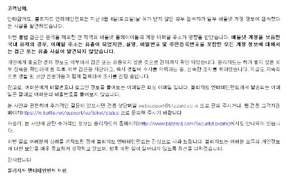 블리자드는 한국 계정 이용자들은 북미 서버와 다르게 비밀번호와 주민등록번호, 기타 개인 정보는 유출되지 않았다고 해명했다.