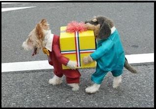 그러나 자세히 들여다 보면 뒤에서 걷고 있는 개와 선물상자는 개 의상에 달린 장식이라는 점을 알 수 있다.