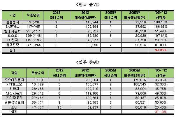한국의 1위 기업인 삼성전자는 매출이 2005년 715억달러(한화 약 78조7천억원)에서 2012년 1천489억달러(한화 약 163조8천억원)로 7년간 성장률이 108.1%에 달했다. 매출이 대략 2배가 된 셈이다.