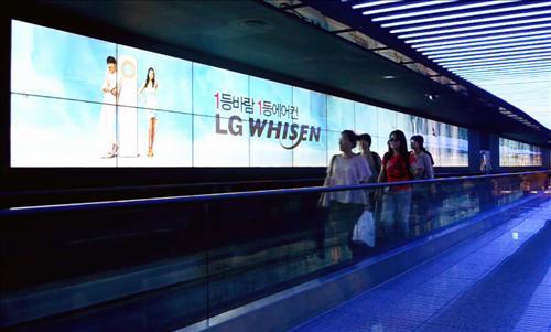 LG전자는 인천공항 무빙워크 옆에 사람의 움직임에 반응하는 높이 1.4미터, 길이 14미터에 달하는 대형 휘센 '디지털 사이니지' 광고판 6개를 최근 설치해 운영 중이다.