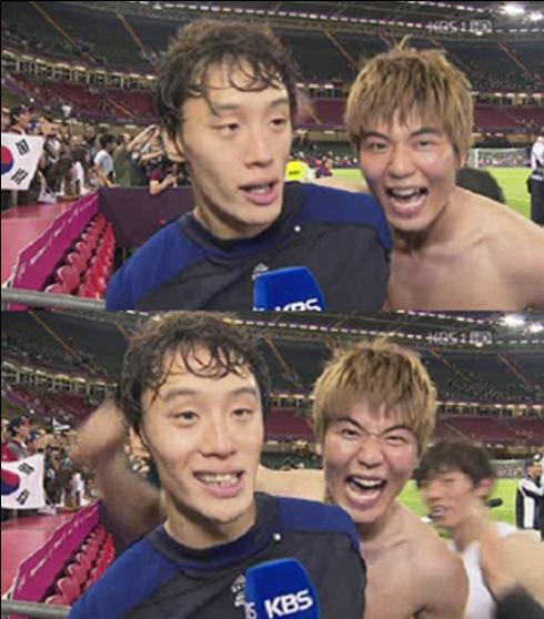 당시 오재석이 "국민 여러분의 성원에 보답하게 돼서..."라고 말하던 도중 카메라를 발견한 기성용은 바로 옆으로 뛰어들어와 '와'하고 계속해서 포효를 했다.