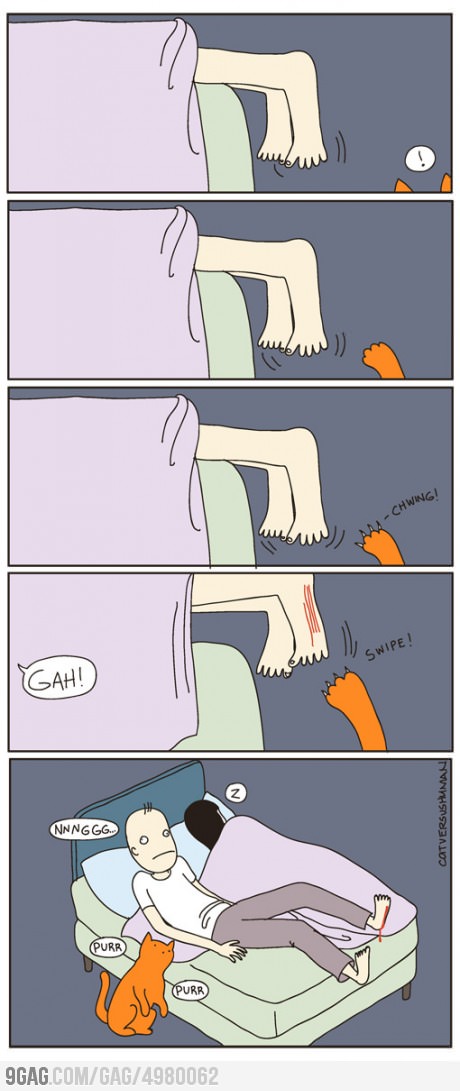 특히 침대 밑에서 같이 잠을 자고 있던 고양이가 침대 밖으로 나온 키 큰 사람의 발을 할퀴어 결국 발에 상처가 나는 고통을 겪게 된다.