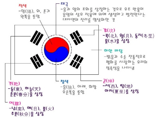 게시물은 태극문양에 대해 '윗 부분인 빨간색은 양을, 파란색은 음을 뜻하며 음양의 상호 작용에 의해 발전한다는 대자연의 진리를 형상화하고 있다'고 설명한다.