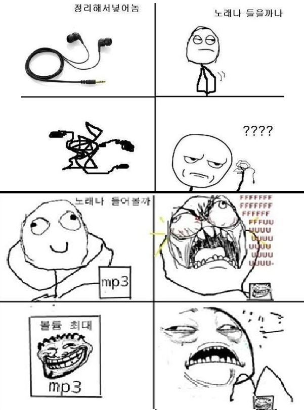 해당 웹툰에서 주인공은 이어폰을 잘 정리해서 넣어 놨으나 mp3를 듣기 위해 이어폰을 꺼냈을 때 줄이 다시 엉커있는 모습을 보고 난감해 하고 있다.