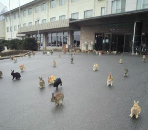 공개된 사진에는 한 건물 앞 공터에 토끼 여러마리가 놓여 있다.