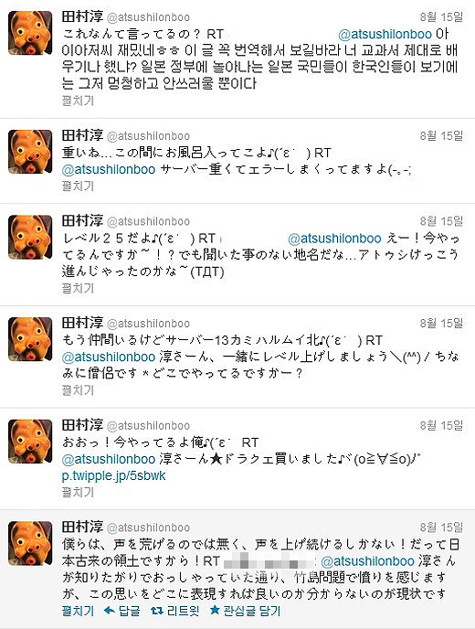 이에 한국 네티즌들은 타무라 아츠시에게 독도가 한국땅이라는 증거등을 제시하며 각종 항의 멘션을 날리기 시작했다.