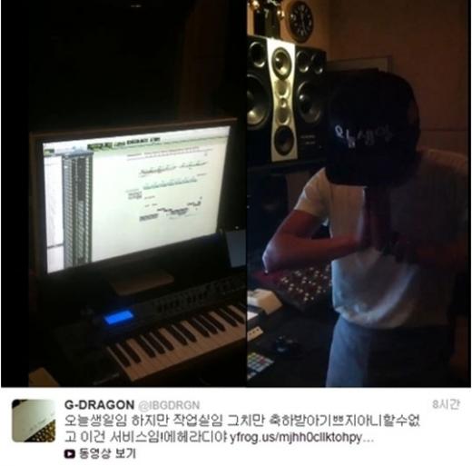빅뱅의 지드래곤은 18일 자신의 트위터에 "오늘 생일임. 하지만 작업실임. 그치만 축하받아 기쁘지 아니할 수 없고 이건 서비스임! 에헤라디야"라는 글과 함께 동영상을 게재했다.