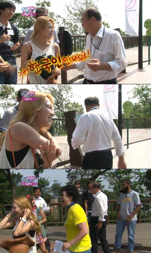 이날 방송에서 한 시민은 노란 머리카락의 효연을 외국인으로 오해하고 “웨얼 아 유 프롬?(Where are you from?)”이라고 물었다.