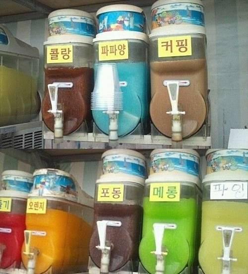 사진에는 다양한 종류의 슬러시가 마련된 가운데 각 통별로 붙어 있는 메뉴 문구가 유독 시선을 끈다. 콜라는 콜랑, 파파야는 파파양, 커피는 커핑 등 애교 넘치게 ‘ㅇ’ 받침을 추가한 것이 특징이다.