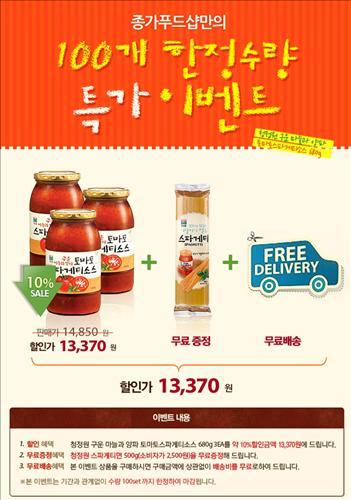 URL복사 기사공유하기 스크랩 프린트 메일보내기 글씨키우기 청정원은 온라인 쇼핑몰 종가푸드샵(www.chonggafood.com)에서 청정원 스파게티 소스 특별 이벤트를 100개 한정으로 진행한다고 20일 밝혔다.청정원 '구운 마늘과 양파 토마토 스파게티 소스' 3개입 세트 구매 시 10%의 가격할인과 함께 이탈리아 정통 스파게티 면을 무료로 증정한다. 종가푸드샵 관계자는 "저렴한 비용으로 가정에서 여럿이 함께 스파게티 요리를 즐길 수 있도록 제품을 구성했다"고 말했다. 저작권자 © 소비자가 만드는 신문 무단전재 및 재배포 금지 이경주 기자 다른기사 보기 URL복사 기사공유하기 주요기사 쿠팡 정보유출 사고로 피싱 시도 가능성 높아... 금융당국 '소비자경보' 발령 김동연 지사, 내년에도 다보스포럼 간다...3년 연속 공식 초청 받아 금호타이어, 폴란드 오폴레 지역에 첫 유럽 공장 짓는다...2028년 8월 가동 예정 국산차 11월 판매 3.9%↓, KGM만 웃었다...베스트셀링카는 ‘쏘렌토’ 김동연 지사, 기후보험 전국 확대 방안 논의..."대한민국의 뉴노멀로" 한신평, 키움·메리츠증권 등급 전망 '긍정적'으로 상향