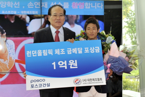 정동화 포스코건설 부회장(현 대한체조협회장)은 20일 인천 송도사옥에서 양학선 선수에게 포상금을 전달하고, 한국 리듬체조 사상 첫 결선 진출의 성과를 일궈낸 손연재 선수의 노고를 치하했다. 이날 행사는 정동화 대한체조협회장, 조성동 체조대표팀 감독, 최영신·김지희 코치, 양학선·손연재 선수를 비롯해 체조협회관계자가 참석한 가운데 진행됐다.