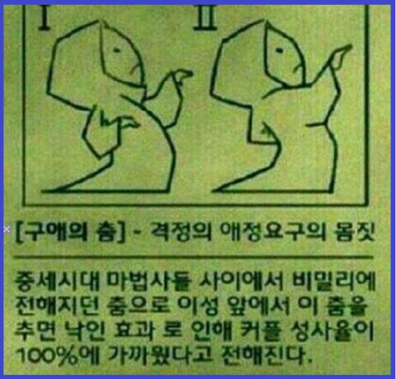 게시물에는 '격정의 애정 요구의 몸짓'이라며 "중세시대 마법사들 사이에서 비밀리에 전해지던 춤으로 이성 앞에서 이 춤을 추면 낙인 효과로 인해 커플 성사율이 100%에 가까웠다고 전해진다"라고 설명되어 있다.