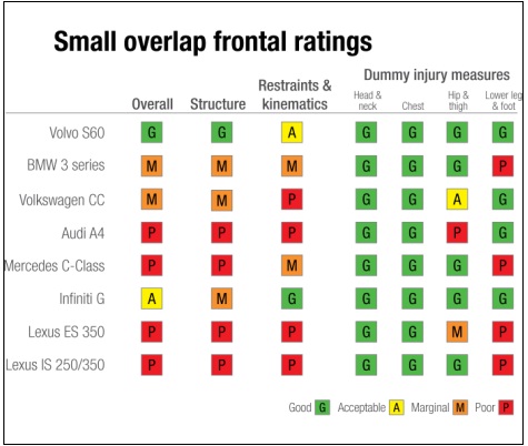 한편 전측면 충돌테스트에서 BMW 3시리즈와 폭스바겐 CC는 '보통'을 메르세데스 벤츠 C 클래스와 아우디 A4 그리고 렉서스 ES350 및 IS250/350은 '불량' 등급을 받았다.