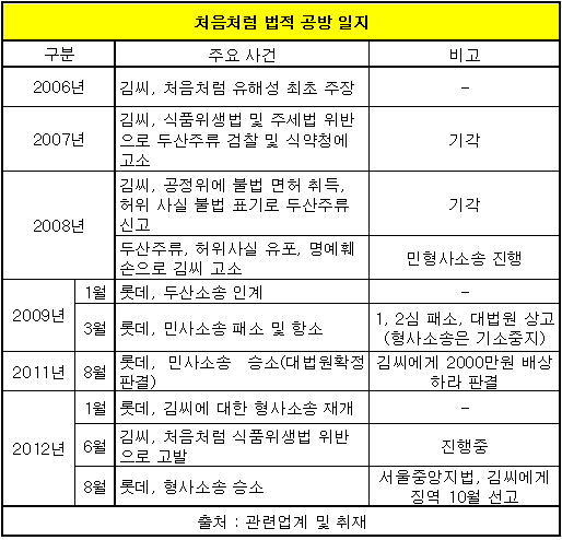 지난 2006년 김 씨의 의혹제기로 시작된 '처음처럼' 유해성 논란은 민사소송이 3심 대법원까지 갔다가 파기 환송돼 지난해 8월 고등법원에서 최종판결이 날 때까지 4번의 재판을 치러야 했고 그 과정에서 김 씨가 무죄에서 일부 유죄로 번복되는 우여곡절을 겪었다.