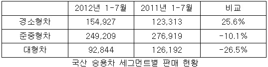 22일 관련업계에 따르면 7월까지 판매된 국산 승용차 가운데 대형차는 9만2천844대로 지난해 같은 기간의 12만6천192대 보다 26.5%나 감소했다.