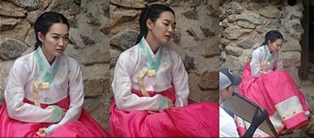 사진 속 신민아는 고운 한복을 입고 머리를 단정하게 땋아 내린 단아한 모습을 하고 있다.