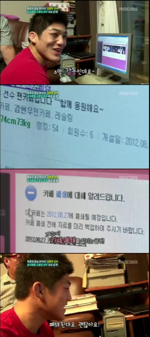 그러나 방문해본 자신의 팬카페 회원수는 6명밖에 안됐으며 이 같은 굴욕에도 불구하고 김현우는 "올림픽 이전에는 팬카페가 없었는데 생겼다. 그런데 회원수가 6명... 감동이다"고 환한 미소를 지었다.