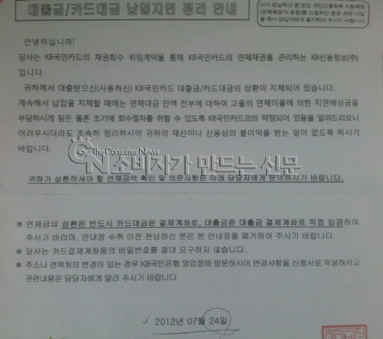 24일 서울시 강남구 도곡동에 사는 박 모(여)씨에 따르면 그는 지난달 26일 난데없이 KB신용정보 측으로부터 채권추심 통지서 한통을 받았다.