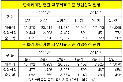 한화케미칼이 올 2분기 부진한 실적을 거뒀다. 순이익이 적자전환되고 영업이익도 시장 기대치를 밑돌았다.