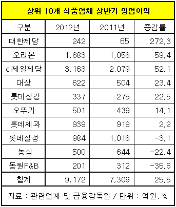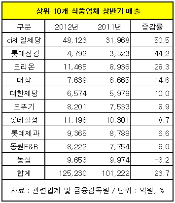 24일 마이경제뉴스팀이 매출액(2011년 기준) 상위 10개 식품기업(상장사 대상)의 올 상반기 매출과 영업이익을 분석한 결과 지난해 같은 기간에 비해 매출액은 평균 23.7%, 영업이익은 25.5% 신장한 것으로 나타났다.