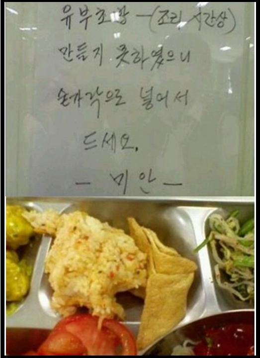게시물에는 급식판 사진과 함께 "유부초밥- 조리시간상 만들지 못하였으니 숟가락으로 넣어서 드세요. 미안"이라는 글이 나와있다.