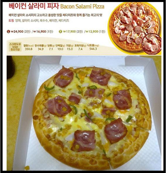 사진에는 피자가게의 피자 메뉴 사진과 실제 배달된 사진이 확연히 다른 모습이다.