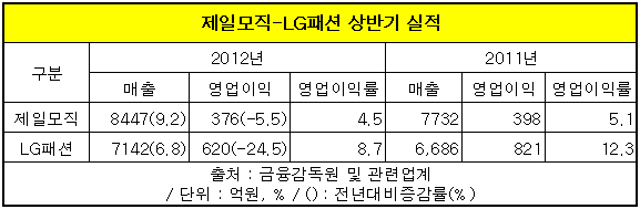 27일 금융감독원에 따르면 제일모직과 LG패션은 상반기 매출이 각각 8천447억원과 7천142억원으로 지난해 같은 기간에 비해 9.2%, 6.8% 증가했지만 영업이익은 마이너스 성장했다.