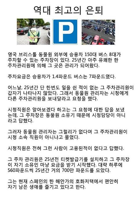 게시물에 따르면 영국 브리스톨 동물원에 있던 한 주차관리원이 25년간 하루도 쉬지 않고 일을 하다 어느 날 갑자기 종적을 감춘다.