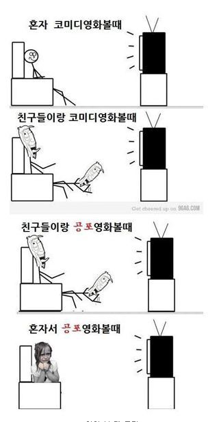 반면 친구와 함께 공포영화를 볼 때는 코미디 영화처럼 깔깔거리며 영화를 보게된다. 또, 혼자 공포영화를 보면 잔뜩 긴장한 채 덜덜 떨면서 본다.