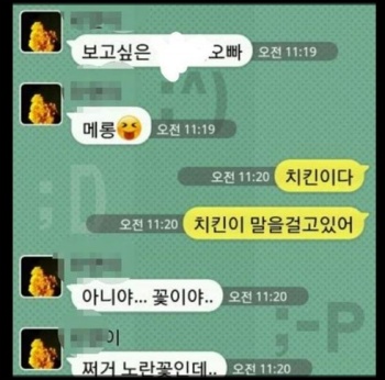 여자가 먼저 남자에게 인사를 건네자 남자는 여자의 프로필 사진을 보고 "치킨이다"고 말했다. 이에 여자는 "아니야 꽃이야. 저거 노란꽃인데"라고 말했다.
