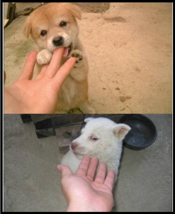 공개된 사진에는 강아지가 여자의 손을 물며 귀여운 애교를 보여준다.