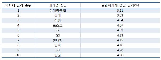 회사채 금리가 가장 높은 한진그룹과 현대중공업의 금리차는 무려 1.37%포인트에 달했다. 회사채 발행 금리가 낮다는 것은 그만큼 시장에서 회사의 재정적인 신용도가 높다는 것을 의미한다. 회사채 금리 1%포인트 차이는 매우 큰 차이다. 1조원을 발행할 때 100억원, 10조원을 발행할 땐 1000억원의 차이가 난다.