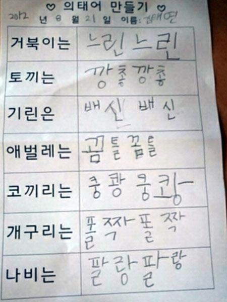 문제지의 주인공 김태연 학생은 거북이는 느린느린, 토끼는 깡총깡총, 애벌레는 꼼틀꼼틀, 코끼리는 쿵쾅쿵쾅, 기린은 배신배신이라고 적어 웃음을 자아낸다.