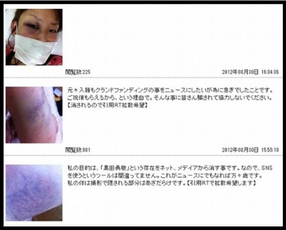 공개된 사진에서 나카무라 루이는 얼굴에 멍이 들어있다. 이어 나카무라는 “칼 뒤쪽으로 내 머리를 쿵쿵치기도 했다”고 전했다.