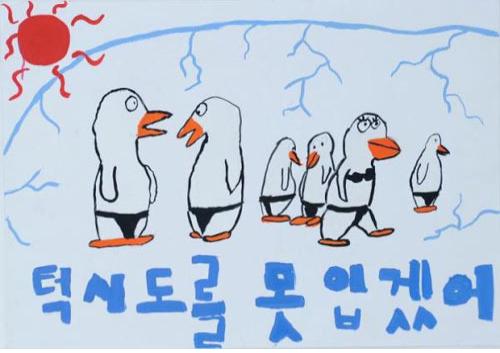 초등학생 온난화 포스터 속의 펭귄들은 모두 검은색이 아닌 흰색 몸체를 선보이고 있으며, 포스터 하단에는 “턱시도를 못 입겠어”라는 글이 쓰여 있다.