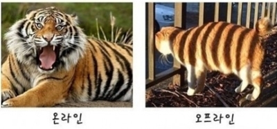 게시물에는 온라인과 오프라인으로 나뉘어 컴퓨터를 통해 온라인에 접속할 때와 현실에서 직접 사람을 대할 때의 변화를 호랑이와 고양이로 비유했다.