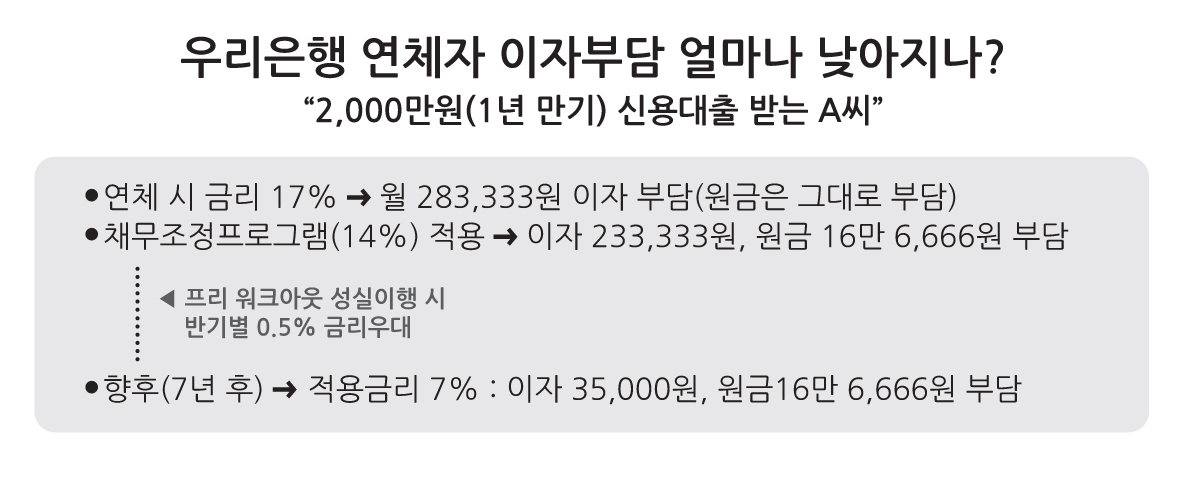 우리은행에 단기 연체대출금을 보유한 고객이 프리워크아웃을 신청하면 최초 14% 금리에 최장 10년 분할상환대출로 전환받는다. 채무조정으로 전환된 대출을 성실히 상환해 나가면 매 반기당 0.5%포인트씩 금리를 인하해 최초금리의 절반인 7%까지 금리가 낮아진다.