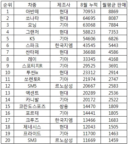 4일 관련 업계에 따르면 국산 승용차와 RV계 모델(스포츠 모델 제외) 가운데 8월말까지 가장 많이 팔린 차는 현대 아반떼로 집계됐다.