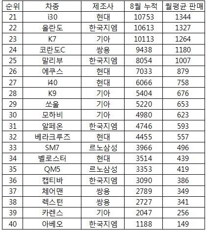 반면 1분기만 해도 9천대를 팔며 베스트셀링 10위에 올랐던 SM5는 8월까지 2만667대로 판매가 둔화되며 톱10에 들지 못했다.